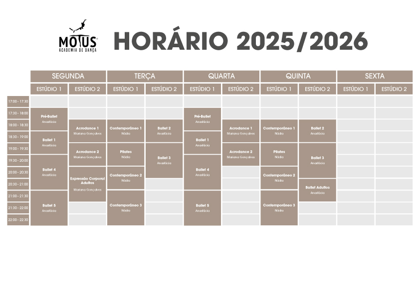 Na MOTUS, acreditamos que cada passo dado no estúdio é uma oportunidade de crescimento e aprendizagem. A nossa missão é proporcionar uma formação completa e enriquecedora aos nossos alunos, independentemente do seu nível técnico ou idade e, para isso, contamos com uma equipa de profissionais certificados, dedicados e apaixonados pelo ensino.